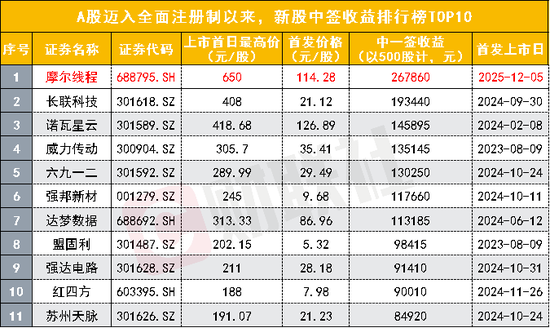 摩尔线程竞价高开468%,总市值近3055亿,股价报650元,中一签盈利近27万元。